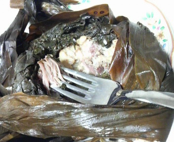 豚肉とお魚をタロの葉で包んで