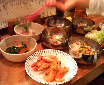 新メニューのニラのユッケ風、甘海老の唐揚げ、うんま〜い。